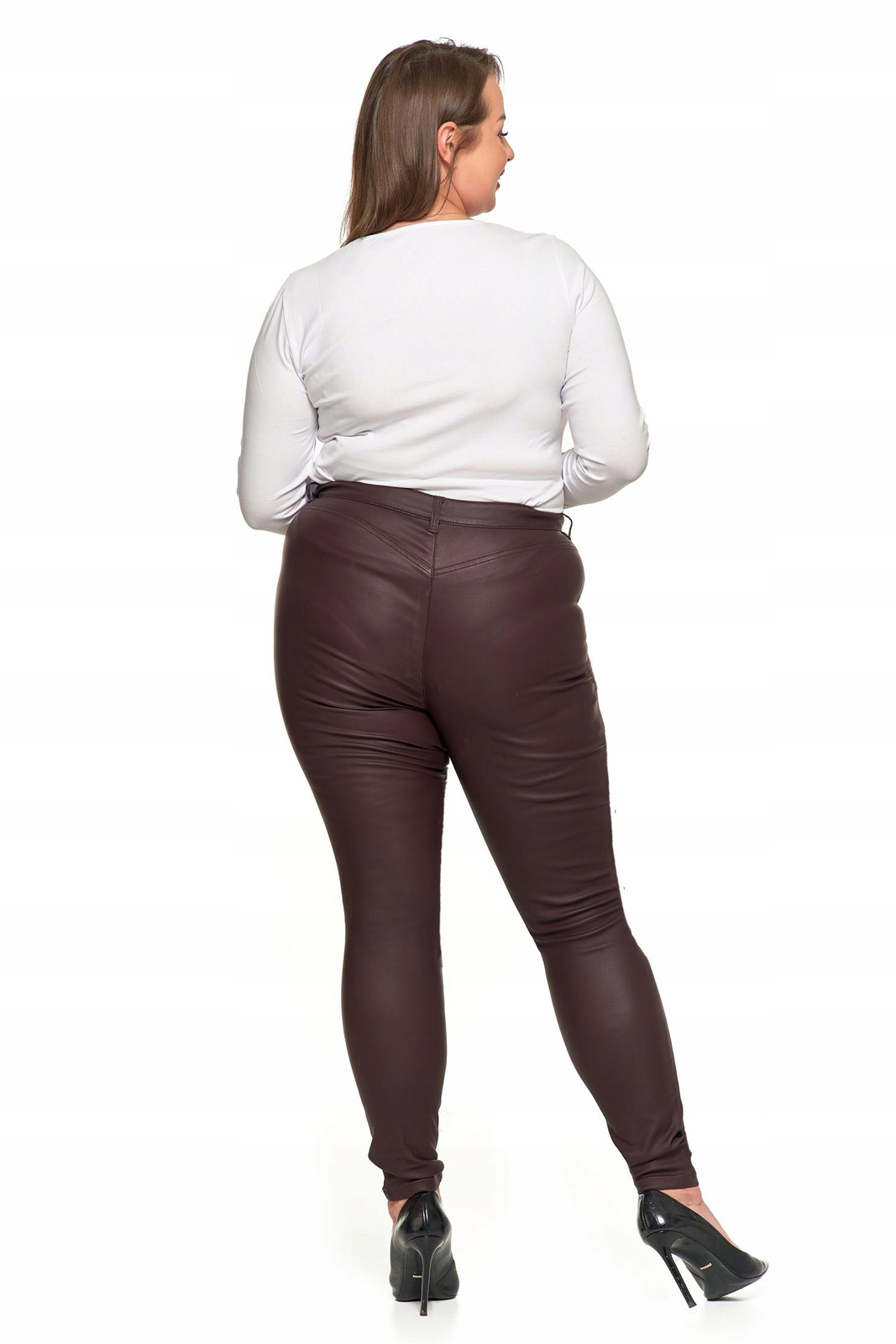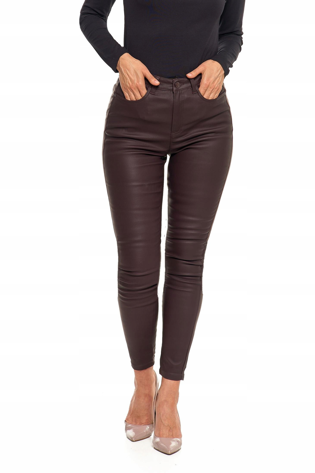 Spodnie Damskie Woskowane Skinny Wysoki Stan Brąz Eko Skóra Rurki r. 42